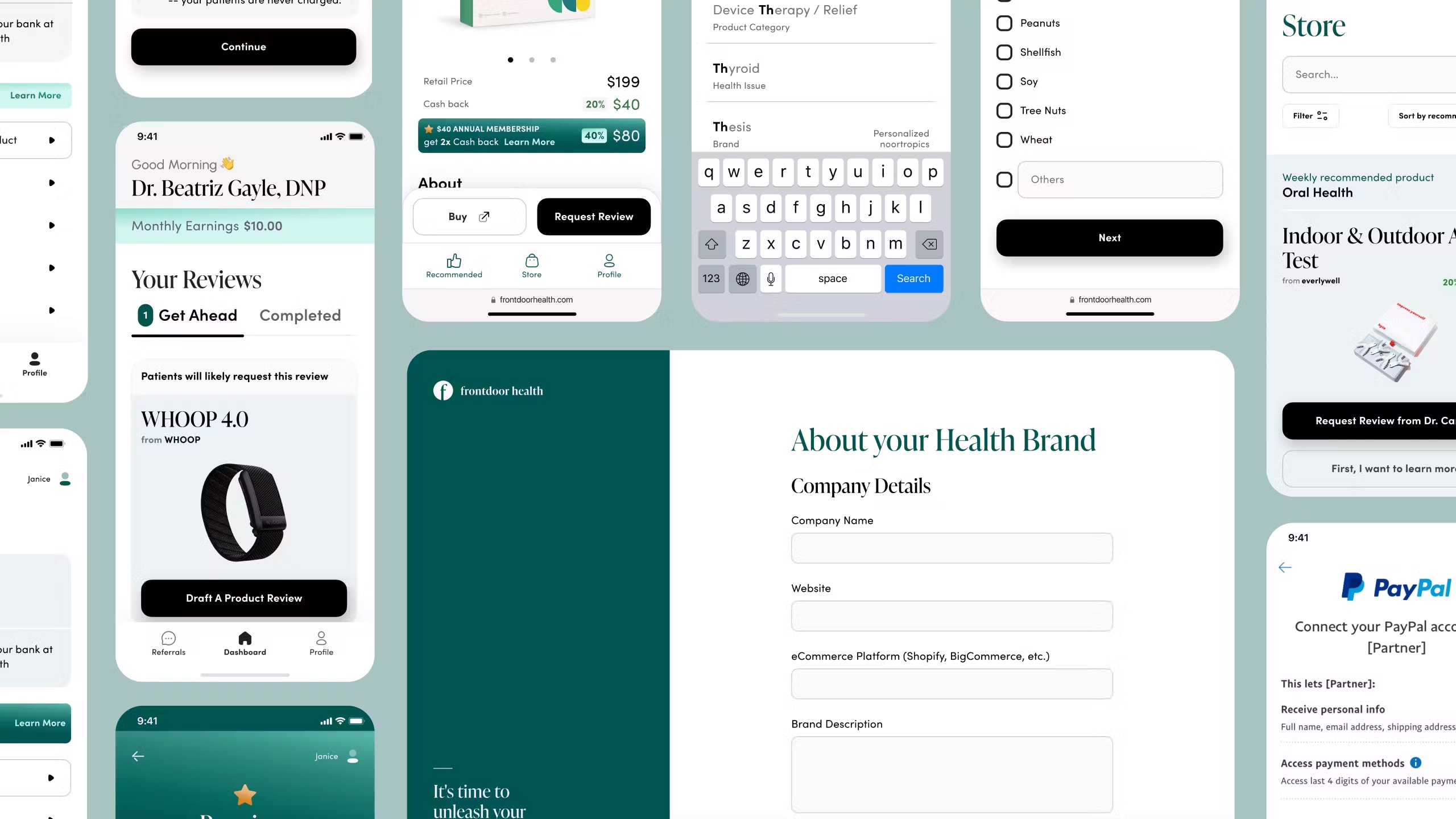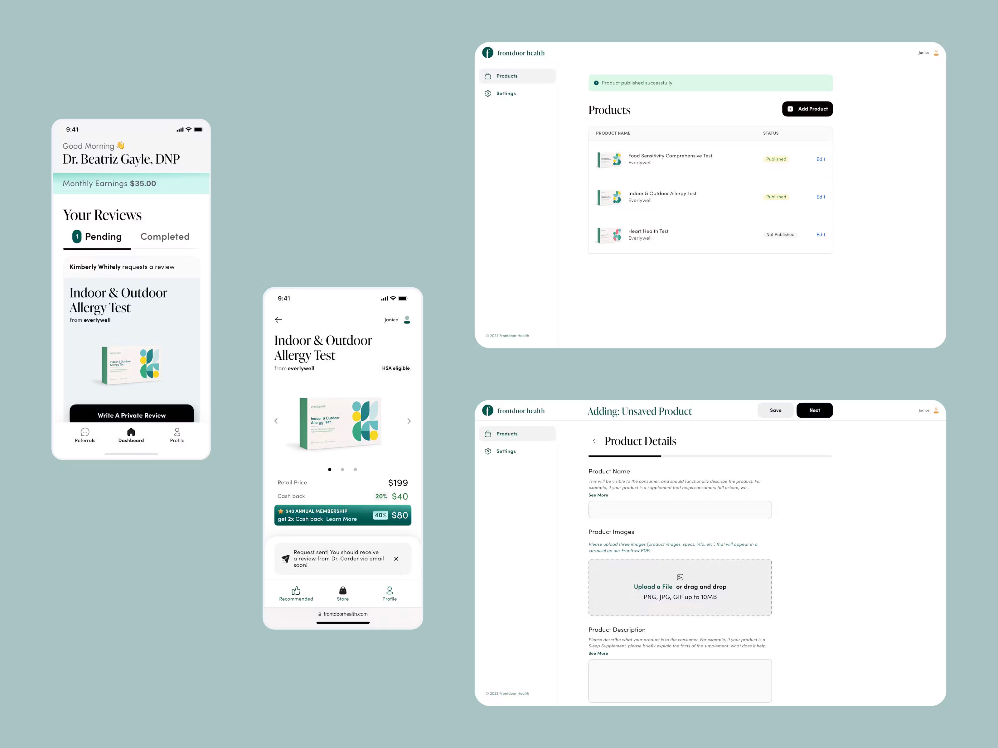 Frontrow Health aims to revolutionize consumer health by allowing users to monetize personal healthcare data and shop for personalized home health products vetted by real doctors. The platform facilitates a doctor-assisted shopping experience, offering doctors additional revenue opportunities through patient onboarding and product reviews. The main goal was to create an MVP tested with users to validate proposed interactions. To meet the project goals, the team initiated a multi-week Product Design Sprint.